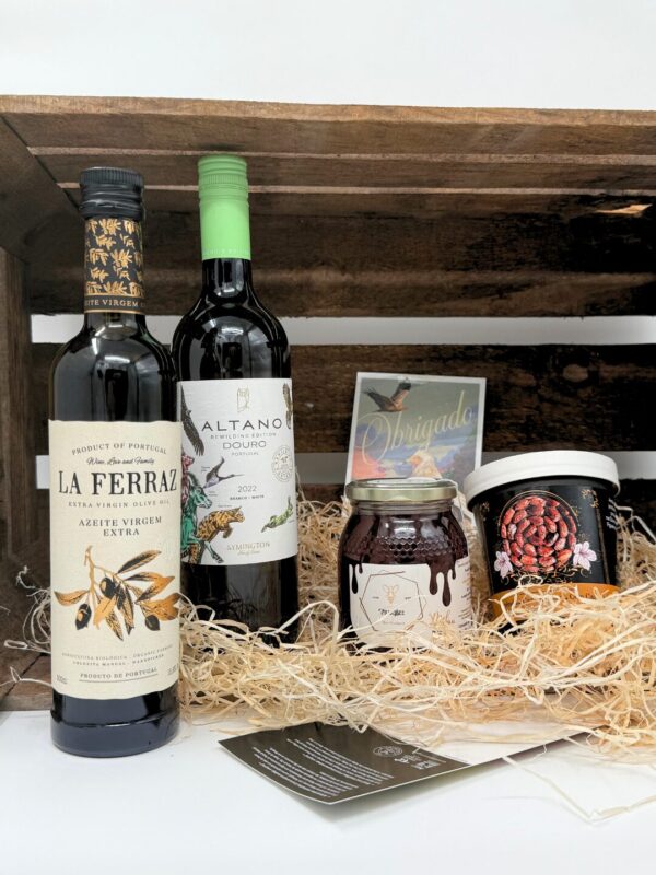Cabaz de produtos típicos locais de membros da Rede Côa Selvagem que contém os seguintes produtos: