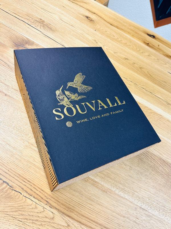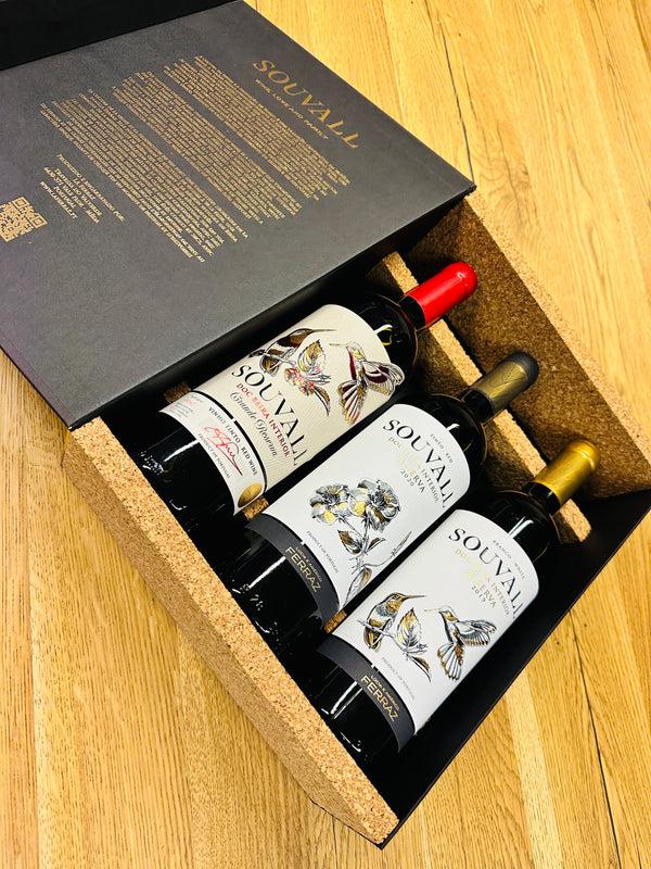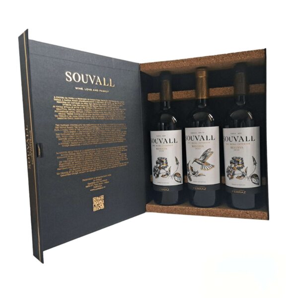Caixas de duas tipologias diferentes de reservas Souvall: três tintos ou um mix tinto-branco-rosé. Produto da família Ferraz, membro da Rede Côa Selvagem, com vinhas localizadas em Horta do Douro e Valeflor, no concelho da Mêda. A Rewilding Portugal procura pôr em evidência os produtos locais do Grande Vale do Côa e apoiar negócios baseados na natureza desta região.