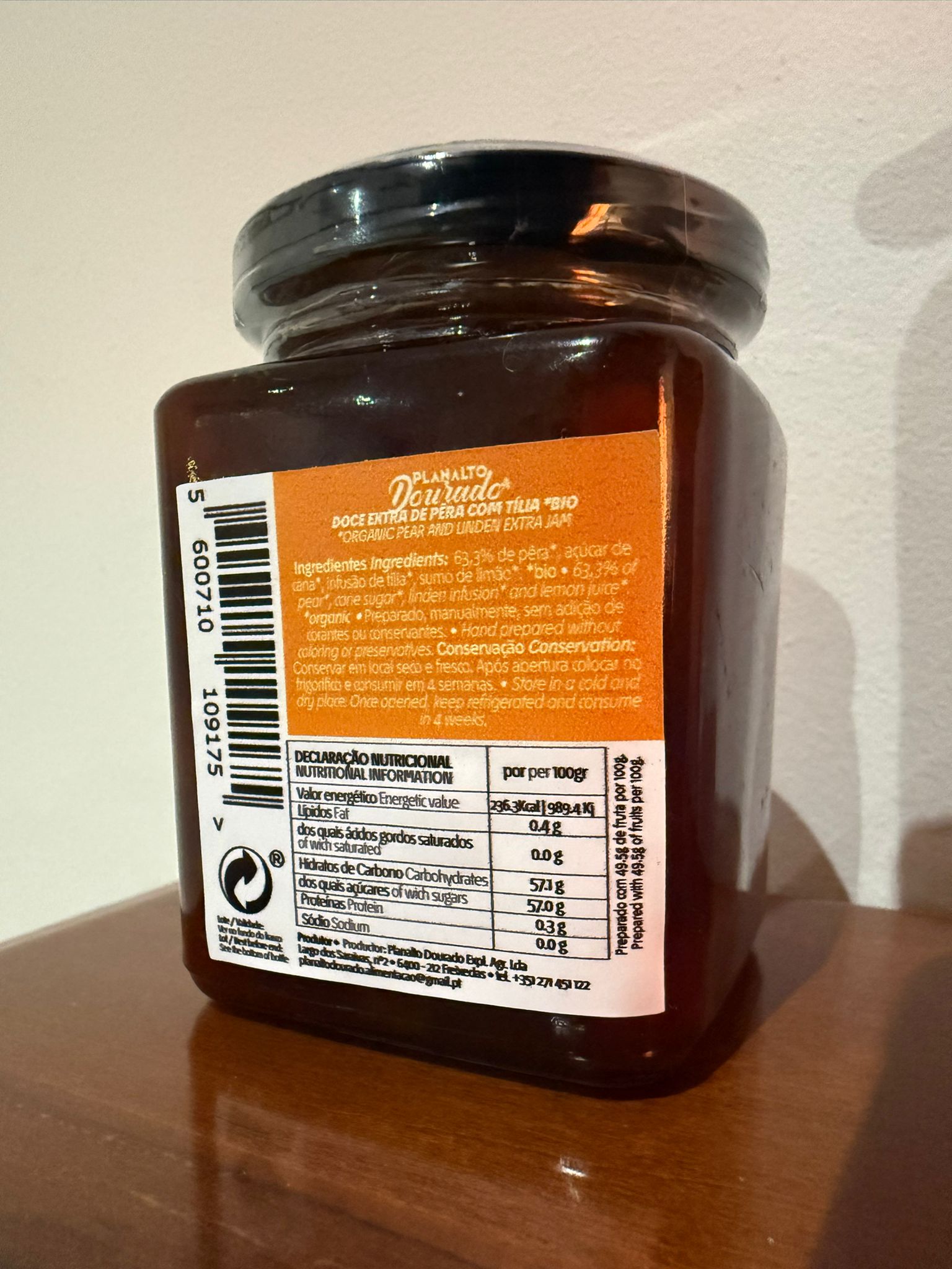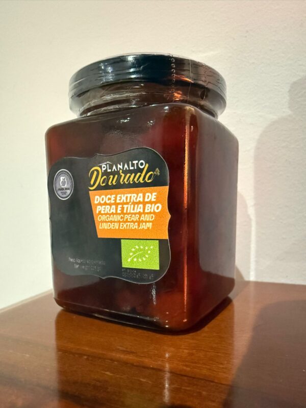 Frasco de 240g de Doce de Pêra com Tília Bio do Planalto Dourado, membro da Rede Côa Selvagem localizado nas Freixedas, no concelho de Pinhel. A Rewilding Portugal procura pôr em evidência os produtos locais do Grande Vale do Côa e apoiar negócios baseados na natureza desta região.