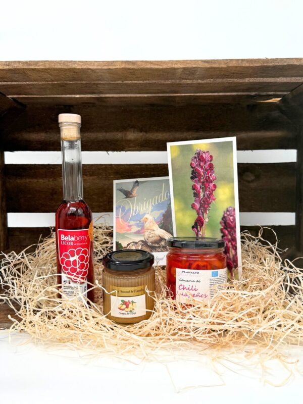 Cabaz de produtos típicos locais de membros da Rede Côa Selvagem que contém os seguintes produtos: