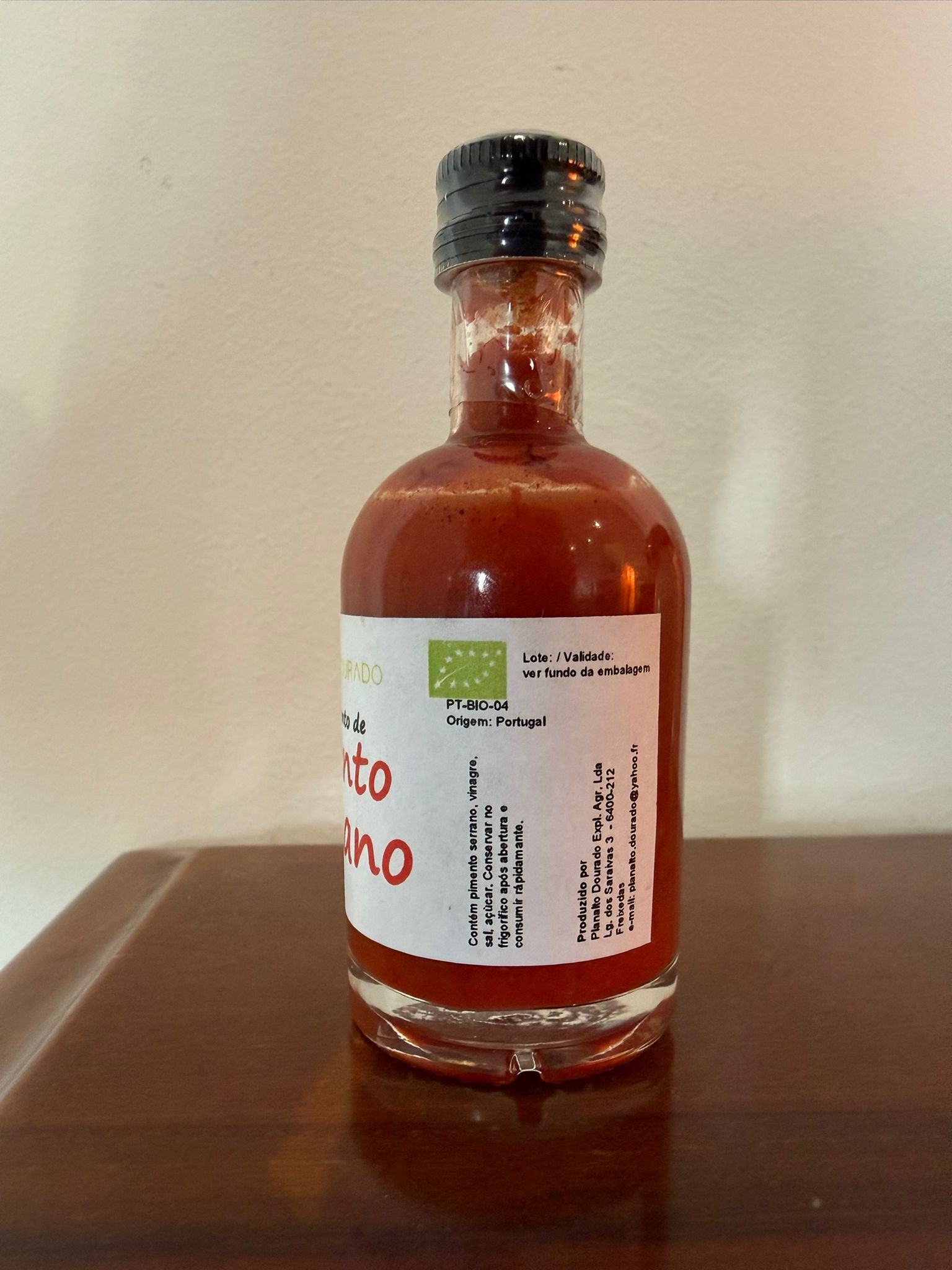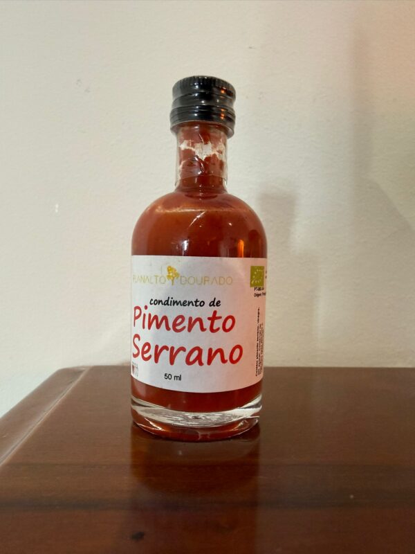 50 ml jar of Organic Serrano Pepper Sauce, produced by Planalto Dourado Exploração Agrícola, Lda, a member of the Wild Côa Network, located in Freixedas, Pinhel.