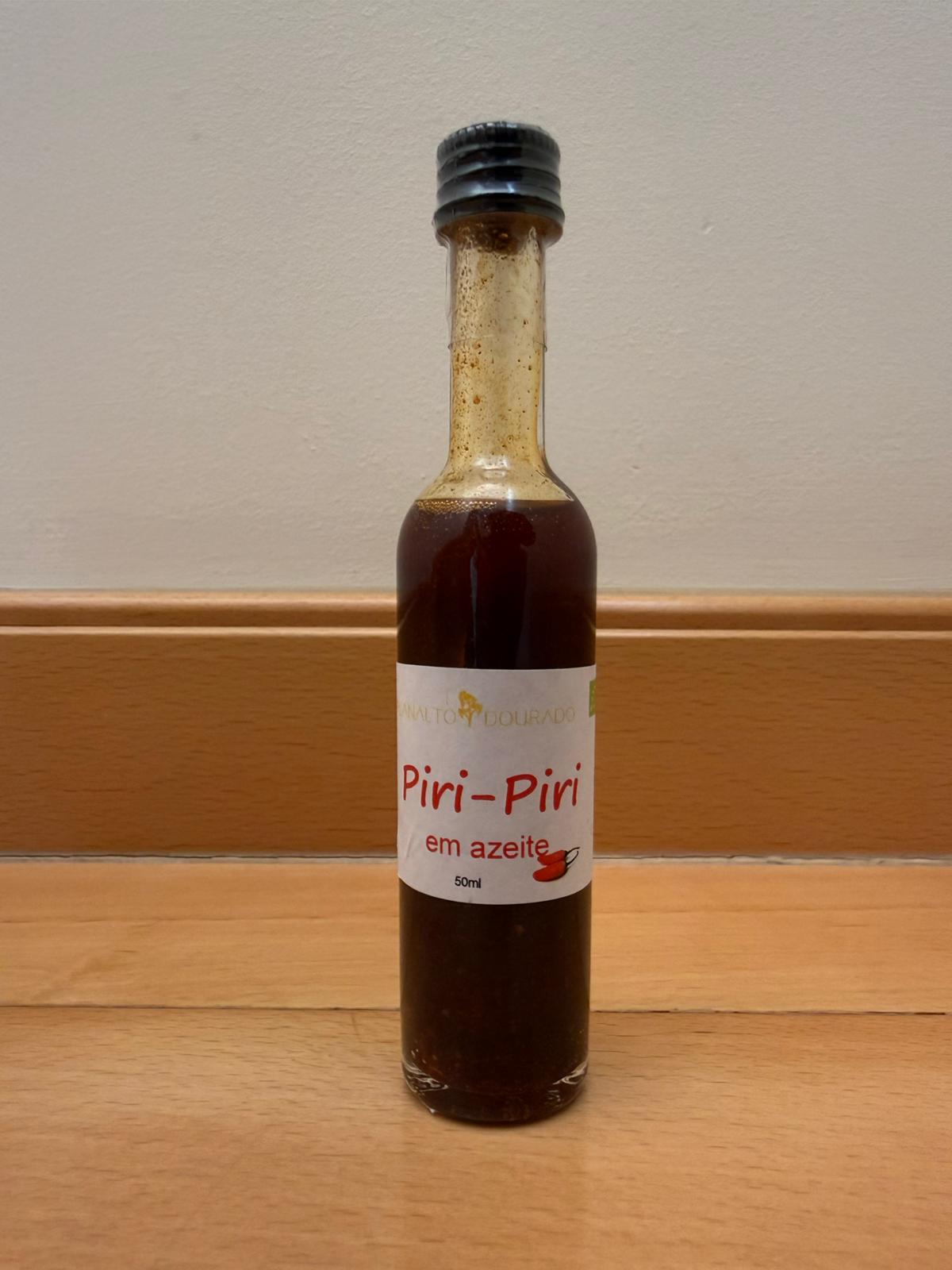 Frasco de 50 ml de Condimento de Piripiri em Azeite Bio produzido pela Planalto Dourado Exploração Agrícola, Lda, membro da Rede Côa Selvagem, localizado em Freixedas, no concelho de Pinhel.