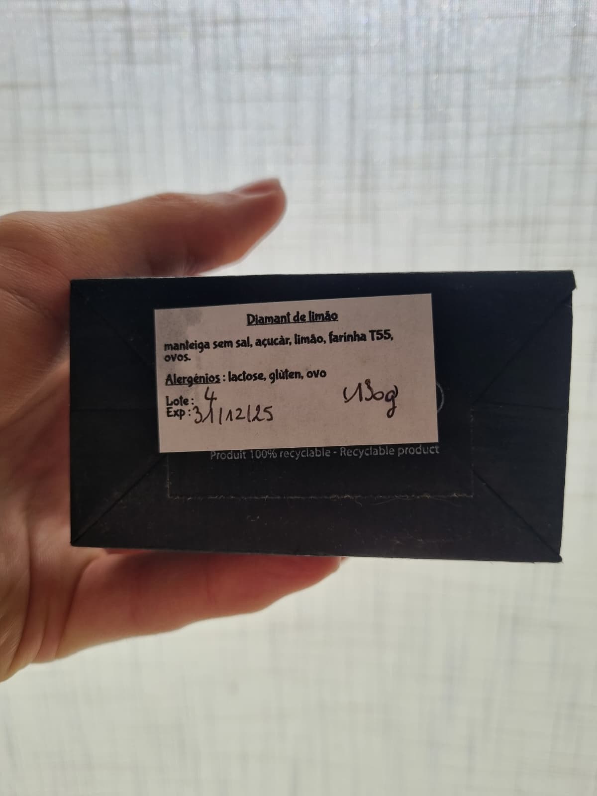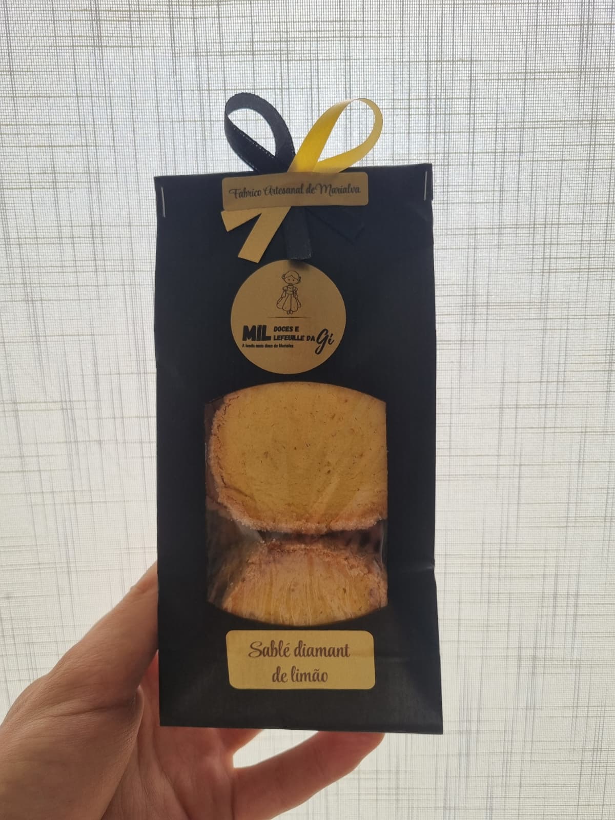 Embalagem de 130g de Sablé Diamant de Limão, produzidos pela Mil Doces e Millefeuille da Gi, membro da Rede Côa Selvagem localizado em Marialva, no município de Mêda.