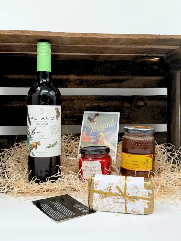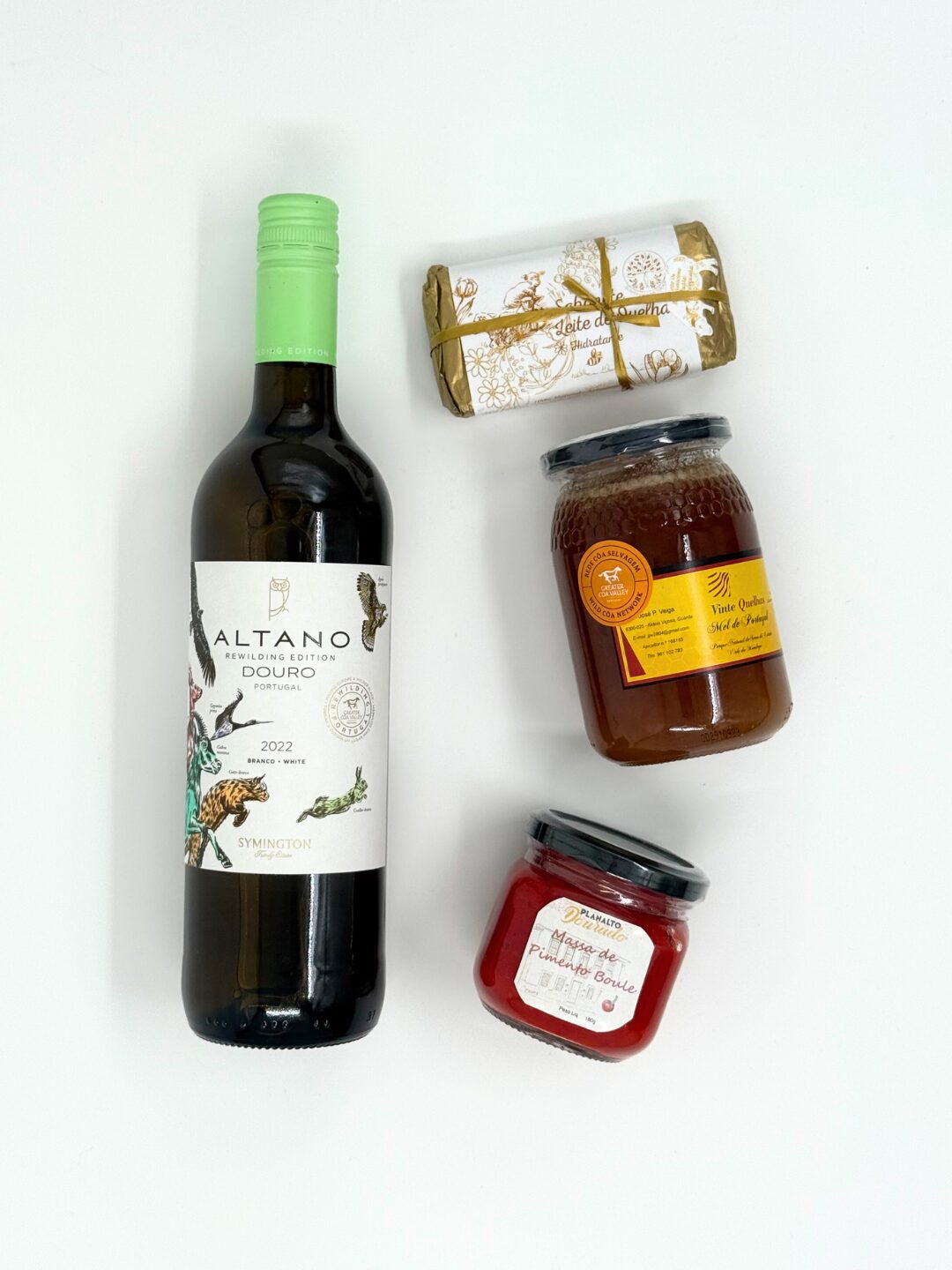 Cabaz de produtos típicos locais de membros da Rede Côa Selvagem que contém os seguintes produtos: