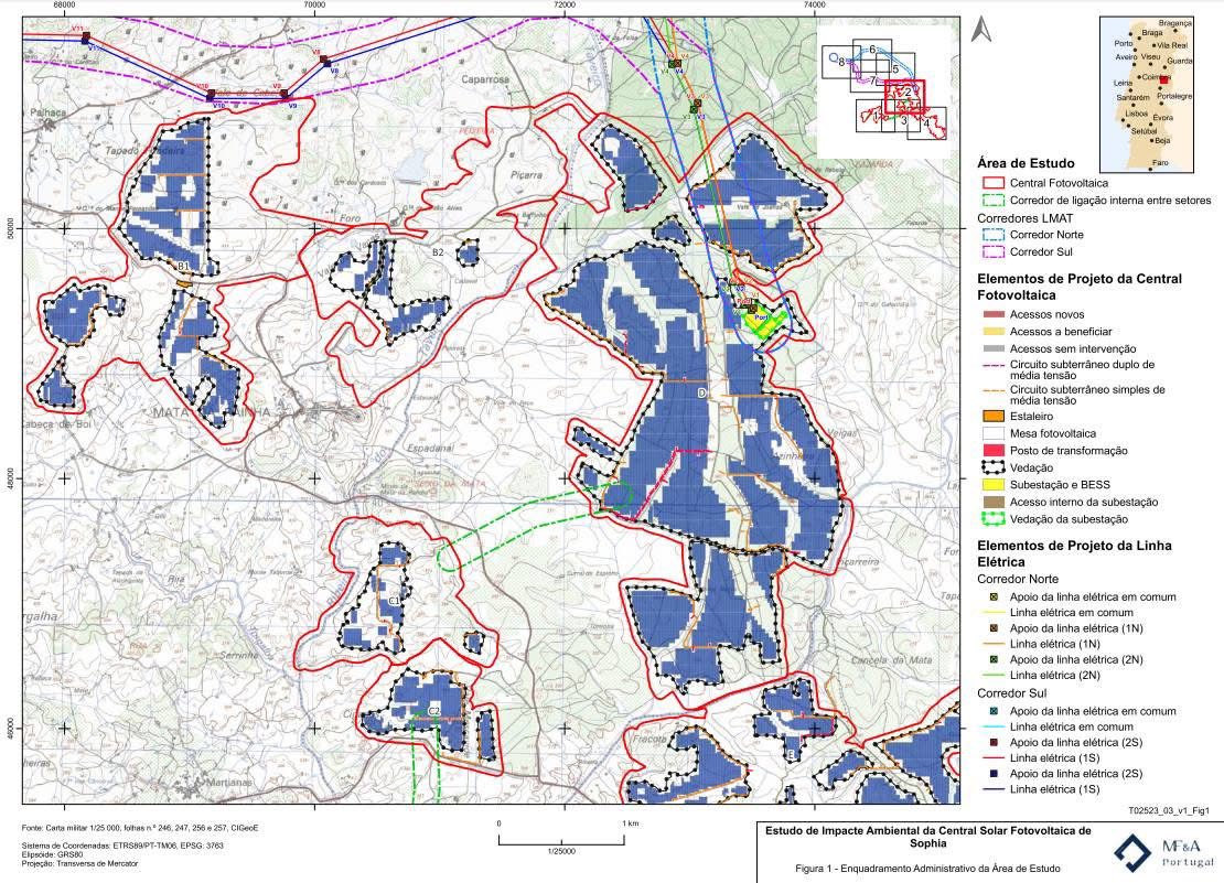 Segundo o EIA, esta central solar ocupará uma área total superior a 3.500 hectares, dos quais cerca de 434 serão diretamente impermeabilizados por painéis solares, caminhos e infraestruturas associadas. O projeto estende-se por três concelhos e integra duas linhas de muito alta tensão (400 kV), com cerca de 22 km cada, para ligação à subestação do Fundão. Estas linhas atravessam zonas agrícolas, povoamentos florestais e vales de ribeiras que mantêm ainda uma conetividade ecológica relevante.